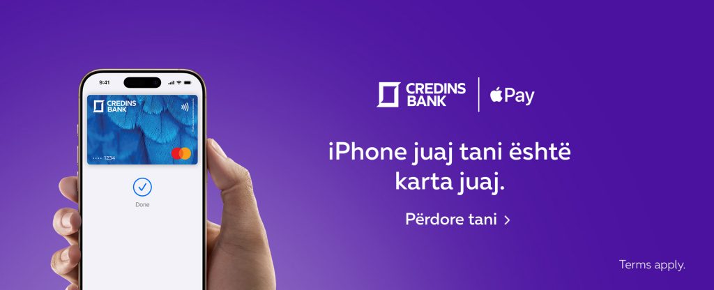 Partneriteti strategjik mes Apple Pay dhe Credins Bank është tashmë një marrëveshje historike, që sjell për klientët një eksperiencë inovative në shërbimet digjitale të pagesave. Klientët e Credins bank, mbajtës të kartave Mastercard, tashmë do të kenë mundësi të kryejnë pagesa dhe transaksione në mënyrën më moderne, të sigurt dhe të shpejtë duke përjetuar një eksperiencë unike.